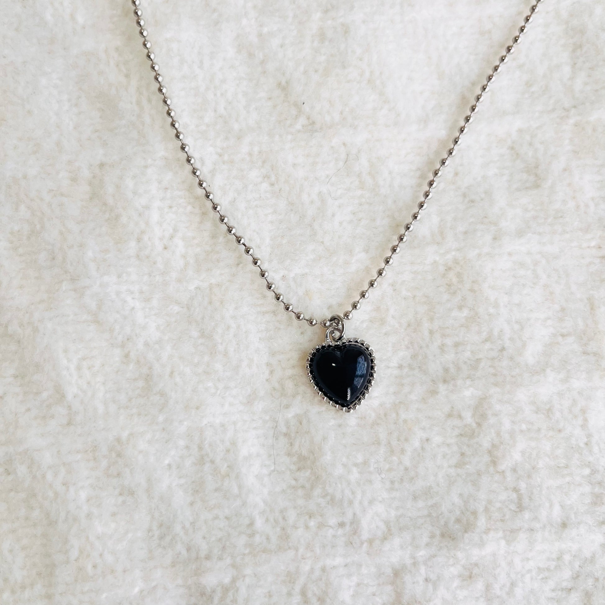 Adorn your neckline with this alluring necklace featuring a striking black gemstone heart pendant, elegantly set on a delicate silver-tone beaded chain. This piece exudes a sophisticated and slightly mysterious charm, perfect for adding a touch of edgy elegance to any ensemble.