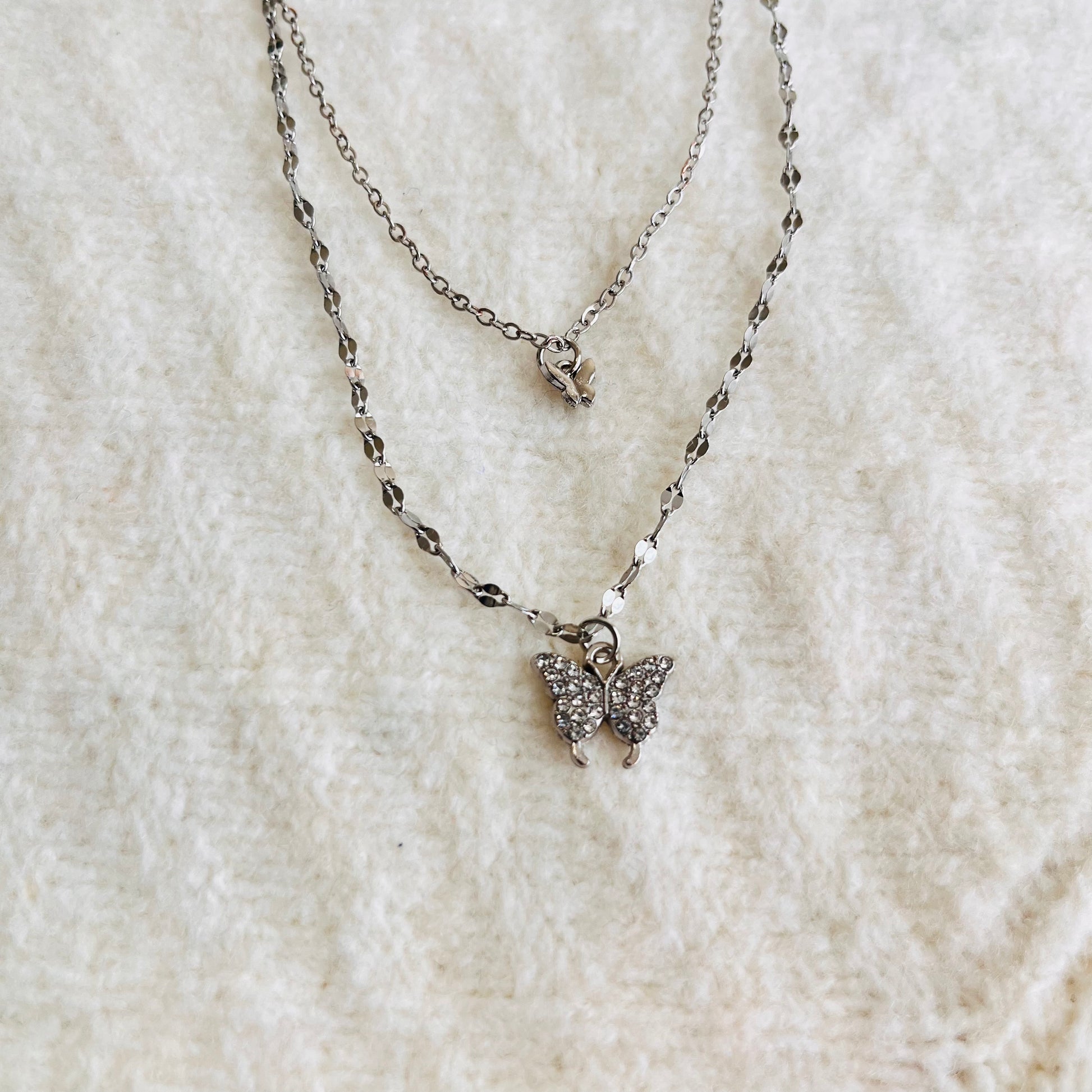Embrace delicate charm with this beautiful silver-tone layered necklace. It features a graceful top chain with a tiny, minimalist butterfly, perfectly complemented by a longer, sparkling chain showcasing a larger, crystal-studded butterfly. This enchanting piece adds a whimsical yet elegant touch to any outfit.