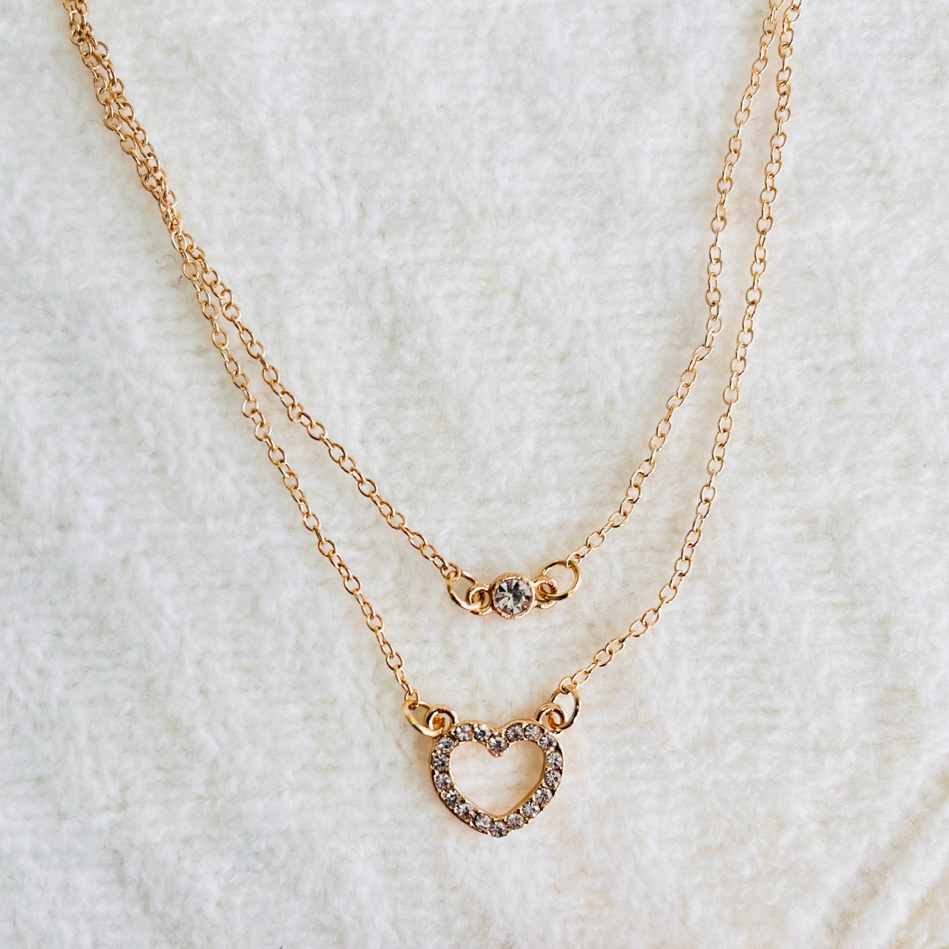 Embrace subtle sparkle with this elegant gold-tone layered necklace. It features a delicate chain with a single shimmering solitaire stone, perfectly complemented by a second chain showcasing a beautiful pave-set open heart. This timeless duo adds a touch of refined charm to any look.